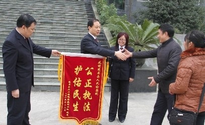 四川在线南充频道讯(通讯员龙虎 唐建东)12月24日,四川省蓬安县人民检察院大门外出现感人的一幕:一位50多岁的农村妇女将一面写有“公正执法、护佑民生”八个大字的锦旗送到该院检察长杨元勇手中。“苦苦申诉两年多的案子终于真相大白了,真没想到这么快7万元赔偿款就领到了手中……”被害人成某某的母亲邹某均说。